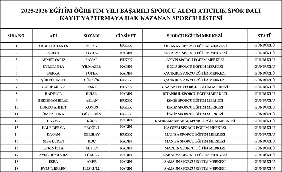2025 - 2026 eğitim öğretim yılında atıcılık spor dalında başarılı sporcu alımı kapsamında sporcu eğitim merkezleri başvuruları 19-30 Ocak 2026 tarihleri arasında yapılmış olup, kayıt yaptırmaya hak kazananlar listesi Ek'te sunulmuştur.